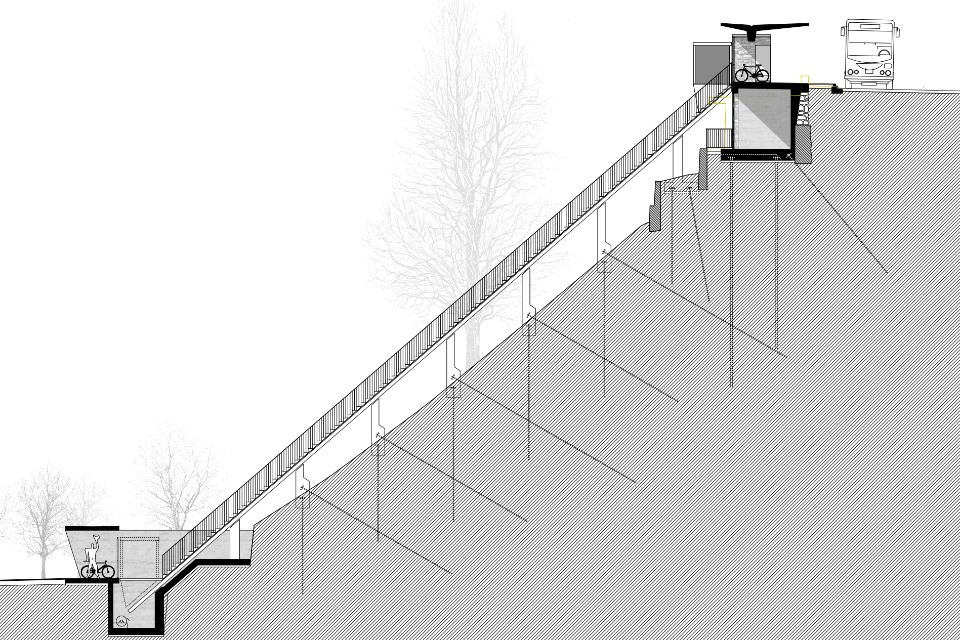 Er soll den Bahnhof mit der Busstation verbinden und so den öffentlichen Verkehr einfacher und bequemer machen. Die Busstation liegt etwa 26 Meter höher als der Bahnhof.